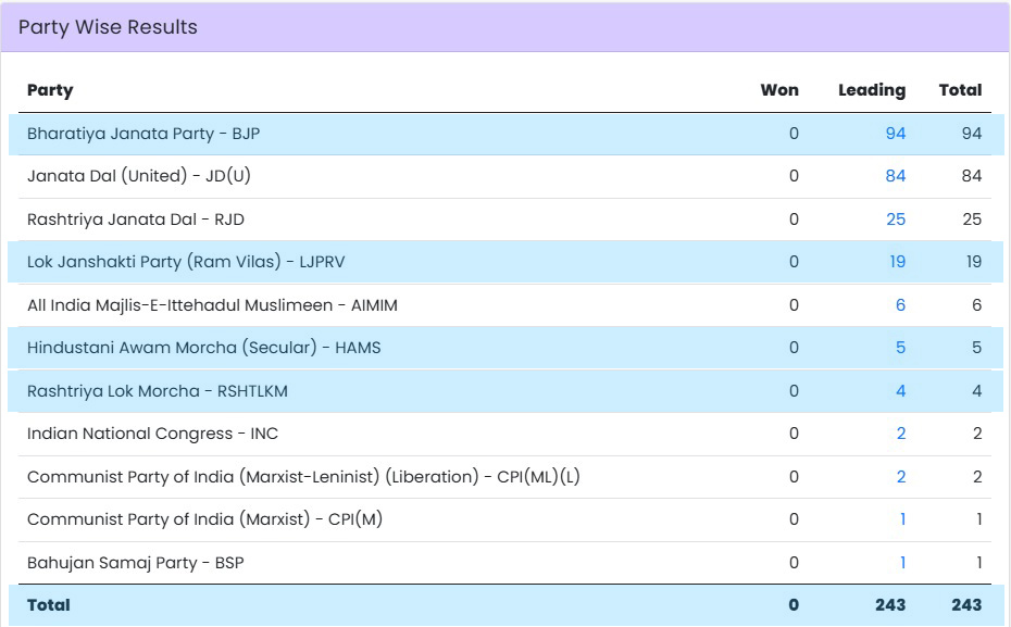 Bihar chunav: बिहार विधानसभा चुनाव के नतीजों में एनडीए की आंधी दिखाई दे रही है, रुझानों में भाजपा 94 सीटों पर आगे है. रुझान जीत में बदले तो नीतीश कुमार के बिना भी भाजपा बिहार में सरकार बना सकती है. बिना जेडीयू के एनडीए की सीटें बहुमत के नंबर 122 पर पहुंच गई हैं. नए समीकरण के मुताबिक, भाजपा अब तक 94 सीटों पर आगे है, चिराग पासवान की पार्टी लोक जनशक्ति पार्टी रामविलास 19 सीटों पर आगे है, जीतन राम मांझी की पार्टी HUM 5 सीटों पर आगे है, वहीं, उपेंद्र कुशवाहा की पार्टी राष्ट्रीय लोक मोर्चा 4 सीटों पर आगे है. सभी पार्टियों का जोड़ मिलाकर 122 बनता है जो बिहार में बहुमत का आंकड़ा है। इनमें जेडीयू की 82 सीटें शामिल नहीं हैं। गौरतलब है कि विधानसभा चुनाव में भाजपा और जेडीयू दोनों 101 सीटों पर उतरी थी, जिसमें 94 सीटों के साथ भाजपा बड़ी पार्टी बनकर उभर रही है।