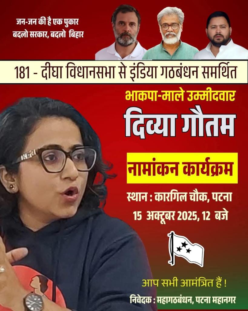 рдорд╣рд╛рдЧрдардмрдВрдзрди рдореЗрдВ рд╕реАрдЯ рд╢реЗрдпрд░рд┐рдВрдЧ рд╕реЗ рдкрд╣рд▓реЗ рдЗрд╕ рдкреЛрд╕реНрдЯрд░ рдиреЗ рд░рд╛рдЬрдиреАрддрд┐рдХ рдЧрд▓рд┐рдпрд╛рд░реЛрдВ рдореЗрдВ рдЗрд╕ рдмрд╛рдд рдХреА рдЪрд░реНрдЪрд╛ рддреЗрдЬ рдХрд░ рджреА рд╣реИ рдХрд┐ рдХреНрдпрд╛ рдорд╣рд╛рдЧрдардмрдВрдзрди рдореЗрдВ рд╡рд╛рдХрдИ рд╕рдм рдареАрдХ рд╣реИ. рджрд░рдЕрд╕рд▓ рд╡рд╛рдпрд░рд▓ рд╣реЛ рд░рд╣рд╛ рдкреЛрд╕реНрдЯрд░ рдкрд░ рдЙрдореНрдореАрджрд╡рд╛рд░реА рдХреЗ рд╕рд╛рде-рд╕рд╛рде рдирд╛рдорд╛рдВрдХрди рдХреА рддрд╛рд░реАрдЦ рдХрд╛ рднреА рдЬрд┐рдХреНрд░ рд╣реИ. рдкреЛрд╕реНрдЯрд░ рдореЗрдВ рд▓рд┐рдЦрд╛ рд╣реБрдЖ рд╣реИ рдХрд┐, ‘181- рджреАрдШрд╛ рд╡рд┐рдзрд╛рдирд╕рднрд╛ рд╕реЗ рдЗрдВрдбрд┐рдпрд╛ рдЧрдардмрдВрдзрди рд╕рдорд░реНрдерд┐рдд рднрд╛рдХрдкрд╛-рдорд╛рд▓реЗ рдЙрдореНрдореАрджрд╡рд╛рд░ ‘рджрд┐рд╡реНрдпрд╛ рдЧреМрддрдо’ рдХреЗ рдирд╛рдорд╛рдВрдХрди рдХрд╛рд░реНрдпрдХреНрд░рдо рдореЗрдВ рдЖрдк рд╕рднреА рдЖрдордВрддреНрд░рд┐рдд рд╣реИ.’