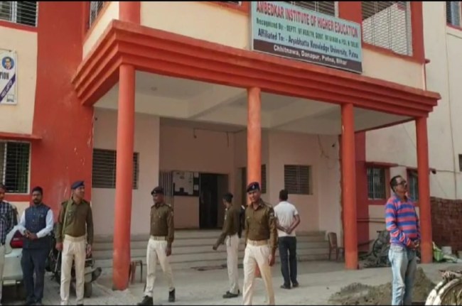 पूरा मामला पटना पुलिस मुख्यालय से करीब 10 किलोमीटर मनेर थाना का छितनावा गांव का है। यहां के अंबेडकर इंस्टीट्यूट ऑफ हायर एजुकेशन कॉलेज (Ambedkar Institute of Higher Education Centre) में नर्सिंग की पढ़ाई करने पुरे बिहार से लड़किया आती हैं, लेकिन आज का नजारा देखिए एके 47 और इंसासा से लैस महिला और पुरुष पुलिस कर्मी की मौजूदगी के बीच क्लास चल रहा है। कॉलेज परिसर मे हथियार बंद पुलिस कर्मियों की चहल कदमी है।