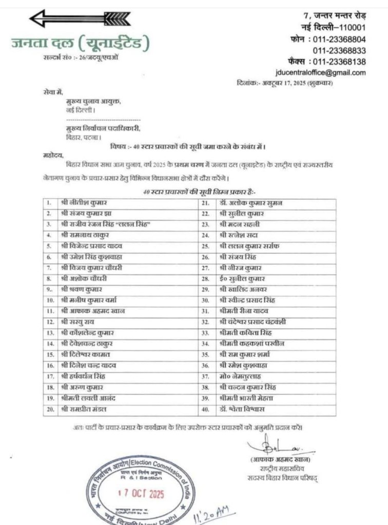 рдЬреЗрдбреАрдпреВ рдХреЗ рд░рд╛рд╖реНрдЯреНрд░реАрдп рдорд╣рд╛рд╕рдЪрд┐рд╡ рдЖрдлрд╛рдХ рдЕрд╣рдордж рдЦрд╛рди рджреНрд╡рд╛рд░рд╛ рдЪреБрдирд╛рд╡ рдЖрдпреЛрдЧ рдХреЛ рднреЗрдЬреЗ рдЧрдП рдкрддреНрд░ рдореЗрдВ рдХрд╣рд╛ рдЧрдпрд╛ рд╣реИ рдХрд┐ рдпреЗ рд╕рднреА рдиреЗрддрд╛ рдмрд┐рд╣рд╛рд░ рдХреЗ рд╡рд┐рднрд┐рдиреНрди рд╡рд┐рдзрд╛рдирд╕рднрд╛ рдХреНрд╖реЗрддреНрд░реЛрдВ рдореЗрдВ рдкрд╛рд░реНрдЯреА рдХреЗ рдкреНрд░рдЪрд╛рд░ рдЕрднрд┐рдпрд╛рди рдХреЛ рдордЬрдмреВрддреА рджреЗрдВрдЧреЗ. рдЗрд╕ рд▓рд┐рд╕реНрдЯ рдХреЗ рд╕рд╛рде рдЬреЗрдбреАрдпреВ рдиреЗ рдЕрдкрдиреЗ рдЪреБрдирд╛рд╡реА рдЕрднрд┐рдпрд╛рди рдХреЛ рдФрдкрдЪрд╛рд░рд┐рдХ рд░реВрдк рд╕реЗ рдЧрддрд┐ рджреЗ рджреА рд╣реИ.