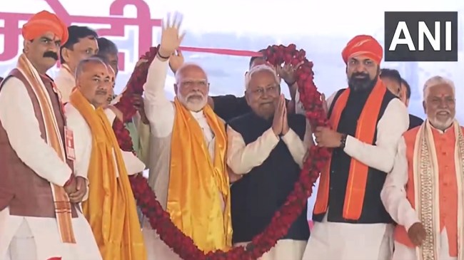 जनसभा के मंच पर जब प्रधानमंत्री मोदी को फूलों की माला पहनाई जा रही थी, तब उन्होंने सीएम नीतीश कुमार का हाथ पकड़कर खींचा और फिर दोनों एक साथ बड़ी सी माला के बीच में आए। इंडिया गठबंधन से अलग होने के बाद पहली बार प्रधानमंत्री मोदी और सीएम नीतीश कुमार एकसाथ एक मंच पर दिखे। इसे लेकर वीडियो सामने आया है।