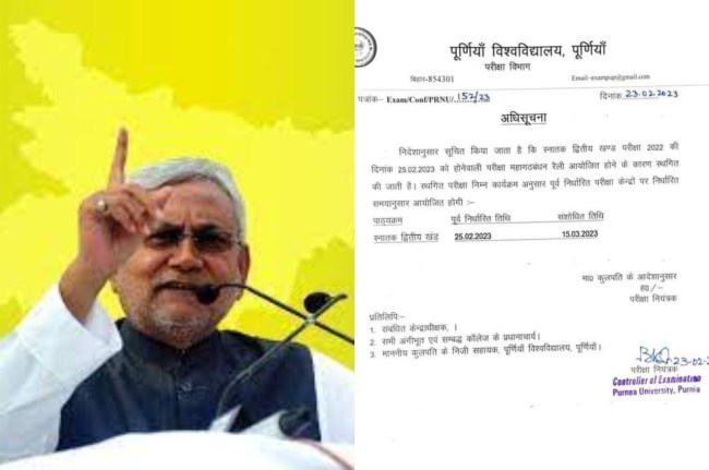 बता दें 25 फरवरी को पूर्णिया के रंगभूमि मैदान में महागठबंधन की एकजुटता रैली आयोजित की गई है। इसी रैली के चलते यूनिवर्सिटी ने परीक्षा स्थगित की है। इस रैली को बिहार में महागठबंधन 2024 लोकसभा चुनाव का चुनावी शंखनाद कहा जा रहा है। पूर्णिया को मुस्लिम बहुल सीमांचल कहा जाता है।