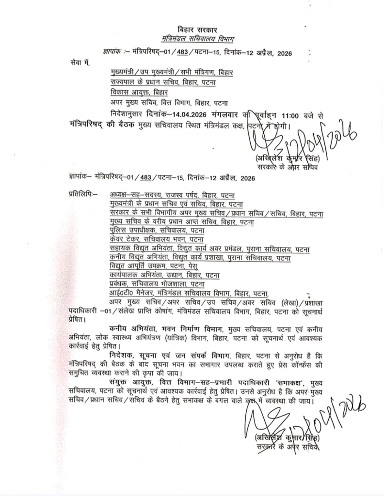 बिहार की राजनीति से इस वक्त की एक बड़ी खबर सामने आ रही है. मुख्यमंत्री नीतीश कुमार ने आगामी 14 अप्रैल को कैबिनेट की एक महत्वपूर्ण बैठक बुलाई है. खास बात यह है कि इसे नीतीश सरकार की इस कार्यकाल की ‘अंतिम कैबिनेट बैठक’ माना जा रहा है. सूत्रों से मिली जानकारी के अनुसार, यह बैठक 14 अप्रैल को सुबह 11:00 बजे आयोजित की जाएगी. इस बैठक का उद्देश्य केवल सरकारी फैसलों पर मुहर लगाना नहीं, बल्कि एक भावनात्मक विदाई भी है. मुख्यमंत्री नीतीश कुमार इस दौरान अपने सभी मंत्रियों के साथ बैठेंगे और अपने कार्यकाल के दौरान किए गए विकास कार्यों और उपलब्धियों पर विस्तार से चर्चा करेंगे.