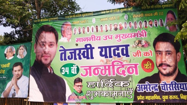 RJD workers called Tejashwi Yadav future CM(рд╕реМрд░рдн рдХреБрдорд╛рд░ ): рдпреВрдкреА рдореЗрдВ рдЕрдЦрд┐рд▓реЗрд╢ рдпрд╛рджрд╡ рдХреЛ ‘рдлреНрдпреВрдЪрд░ CM’ рдмрддрд╛рдП рдЬрд╛рдиреЗ рдХреЗ рдмрд╛рдж рдЕрдм рдмрд┐рд╣рд╛рд░ рдореЗрдВ рдкреЛрд╕реНрдЯрд░ рд╡рд╛рд░ рдЫрд┐реЬ рдЧрдпрд╛ рд╣реИред рдЫрд┐реЬ рдЧрдпрд╛ рд╣реИред рдЕрдм рдПрдХ рдмрд╛рд░ рдлрд┐рд░ рдЖрд░рдЬреЗрдбреА рд╕рдорд░реНрдердХреЛрдВ рдиреЗ рдкреЛрд╕реНрдЯрд░ рд▓рдЧрд╛рдХрд░ рддреЗрдЬрд╕реНрд╡реА рдХреЛ рдмрд┐рд╣рд╛рд░ рдХрд╛ рднрд╛рд╡реА рдореБрдЦреНрдпрдордВрддреНрд░реА рдмрддрд╛ рджрд┐рдпрд╛ рд╣реИред рд╕рд╛рде рд╣реА рдкреЛрд╕реНрдЯрд░ рдореЗрдВ рдЙрдиреНрд╣реЗрдВ 34 рд╡реЗрдВ рдЬрдиреНрдорджрд┐рди рдХреА рдмрдзрд╛рдИ рдФрд░ рд╢реБрднрдХрд╛рдордирд╛рдПрдВ рджреА рдЧрдИ рд╣реИрдВред рдмрд┐рд╣рд╛рд░ рдореЗрдВ рдорд╣рд╛рдЧрдардмрдВрдзрди рдХреА рд╕рд░рдХрд╛рд░ рдмрдирдиреЗ рдХреЗ рдмрд╛рдж рд╕реЗ рд╣реА рдбрд┐рдкреНрдЯреА рд╕реАрдПрдо рддреЗрдЬрд╕реНрд╡реА рдпрд╛рджрд╡ рдХреЛ рдореБрдЦреНрдпрдордВрддреНрд░реА рдмрдирд╛рдиреЗ рдХреА рдорд╛рдВрдЧ рдЙрдарддреА рд░рд╣реА рд╣реИред рдЖрд░рдЬреЗрдбреА рдХреЗ рдмрдбрд╝реЗ рдиреЗрддрд╛ рдЗрд╢рд╛рд░реЛрдВ-рдЗрд╢рд╛рд░реЛрдВ рдореЗрдВ рддреЗрдЬрд╕реНрд╡реА рдХреЛ рд╕реАрдПрдо рдмрдирд╛рдиреЗ рдХреА рдорд╛рдВрдЧ рдХрд░рддреЗ рд░рд╣реЗ рд╣реИрдВред
