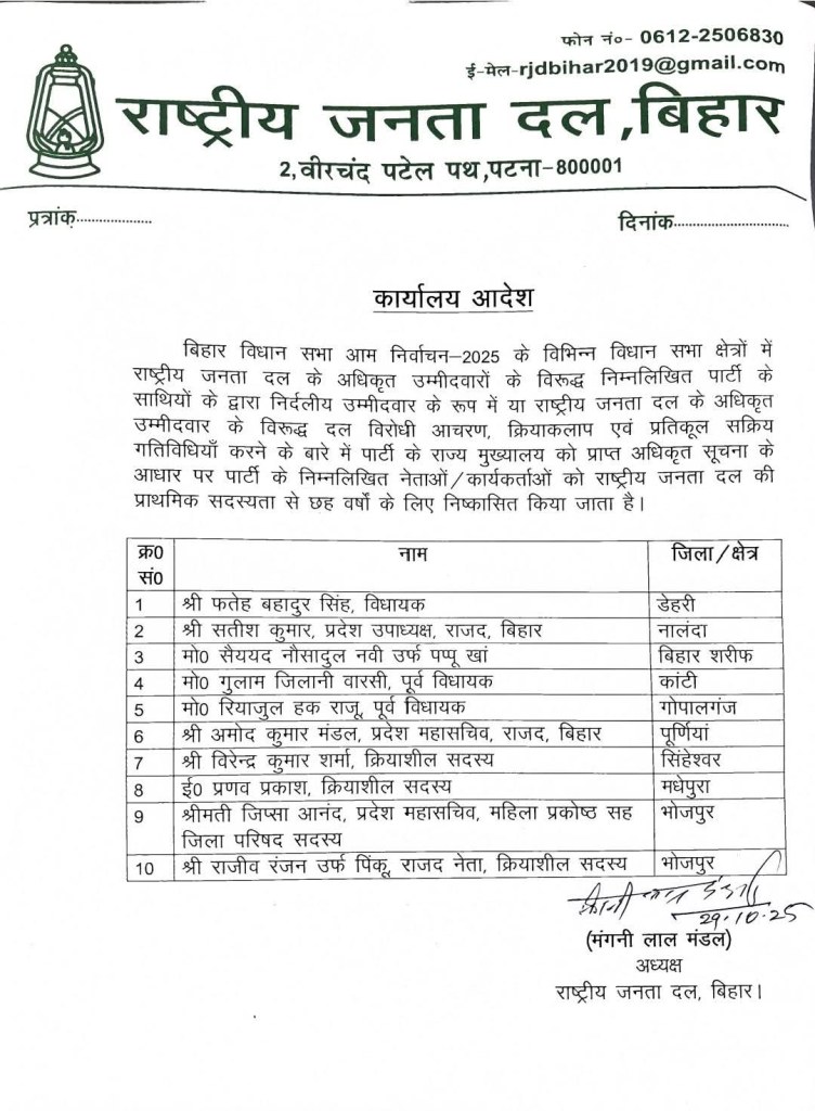 जिन लोगों पर पार्टी की तरफ से एक्शन लिया गया है, उसमें RJD के विधायक और पूर्व विधायक सहित कई पदाधिकारी शामिल हैं. राजद की ओर से पार्टी के प्रदेश अध्यक्ष मंगनी लाल मंडल ने पत्र जारी कर इन नेताओं को पार्टी से 6 साल के लिए बाहर का रास्ता दिखाया है. पत्र के अनुसार, डेहर विधान सभा सीट से विधायक फतेह बहादुर सिंह, बिहार के नालांदा प्रदेश उपाध्यक्ष सतीश कुमार, बिहार शरीफ से मोहम्द सैययद नौसादुल नवी उर्फ पप्पू खां, कांटी से पूर्व विधायक मोहम्मद गुलाम जिलानी वारसी, गोपालगंज विधान सभा सीट से पूर्व विधायक मोहम्मद रियाजुल हक राजू, पूर्णियां के प्रदेश महासचिव अमोद कुमार मंडल, सिंहेश्वर से पार्टी सदस्य विरेन्द्र कुमार शर्मा, मधेपुरा से पार्टी सदस्य प्रणव प्रकाश, भोजपुर से प्रदेश महासचिव, महिला प्रकोष्ठ सह जिला परिषद सदस्य जिप्सा आनंद और भोजपुर से पार्टी सदस्य राजीव रंजन उर्फ पिंकू के नाम शामिल हैं.