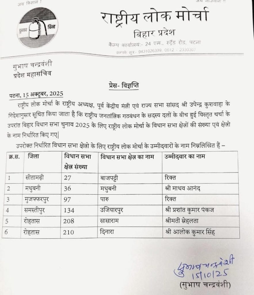 बता दें कि उपेंद्र कुशवाहा की पार्टी उजियारपुर, मधुबनी, सासाराम, दिनारा, पारू, बाजपट्टी सीट से बिहार विधानसभा चुनाव 2025 के रण में उतरेगी. पार्टी के प्रदेश महासचिव सुभाष चन्द्रवंशी ने बताया कि सासाराम विधानसभा सीट से उपेंद्र कुशवाहा की पत्नी स्नेहलता को टिकट दिया गया है, वहीं दिनारा से आलोक कुमार सिंह, उजियारपुर से प्रशांत कुमार पंकज और मधुबनी से माधव आनंद को चुनावी रण में उतारा गया है. पारू और बाजपट्टी सीटों से उम्मीदवारों की घोषणा बाद में की जाएगी.