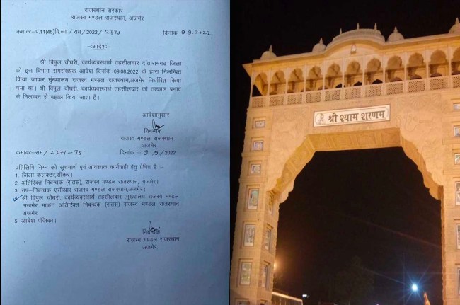 बता दें कि खाटूश्यामजी में भगदड़ के दौरान कार्यव्यवस्थार्थ तहसीलदार विपुल चौधरी को सस्पेंड किया गया था। हाल फिलहाल खाटूश्यामजी भगदड़ प्रकरण की संभागीय आयुक्त स्तर पर जांच की जा रही है।