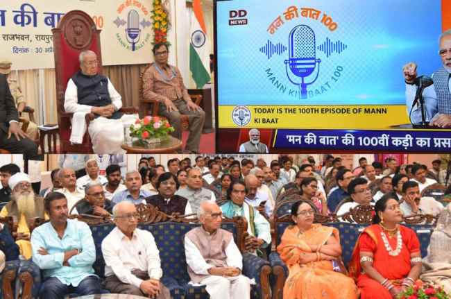 Chhattisgarh: राज्यपाल विश्वभूषण हरिचंदन ने प्रधानमंत्री नरेन्द्र मोदी ‘मन की बात‘ कार्यक्रम की 100वीं कड़ी के प्रसारण के अवसर पर राजभवन में आयोजित कार्यक्रम में कहा कि यह केवल एक कार्यक्रम नहीं है बल्कि लोगों को प्रेरणा देने, हमारे बीच प्रेरक प्रसंगों को सामने लाने और नये भारत के निर्माण के लिए जरूरी विचारों को जनआंदोलन का रूप देने का एक सशक्त मंच है। वास्तव में मन की बात कार्यक्रम पूरे भारत की जनता की मन की बात है। मन की बात कार्यक्रम के 100वीं कड़ी के प्रसारण पर राजभवन में एक बृहद कार्यक्रम का आयोजन किया गया। जिसमें पद्मश्री पुरूस्कार से सम्मानित विशिष्टजन, फिल्म, खेल, चिकित्सा क्षेत्र के विशिष्टजन, मन की बात में छत्तीसगढ़ के जिन व्यक्तियों का उल्लेख हुआ था, वे सभी विशिष्टजन और गणमान्य नागरिक उपस्थित थे।