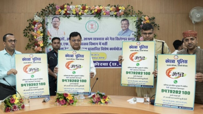 कोरबा पुलिस प्रशासन ने महिलाओं की सुरक्षा सुनिश्चित करने के लिए ‘मैत्री व्हाट्सऐप हेल्पलाइन’ (9479282100) लॉन्च की है। वाणिज्य एवं श्रम मंत्री श्री लखन लाल देवांगन ने गांधी जयंती के अवसर पर इसका शुभारंभ किया। #महिलासुरक्षा #Korba pic.twitter.com/4cxCLYqIcg— Jansampark CG (@DPRChhattisgarh) October 3, 2024