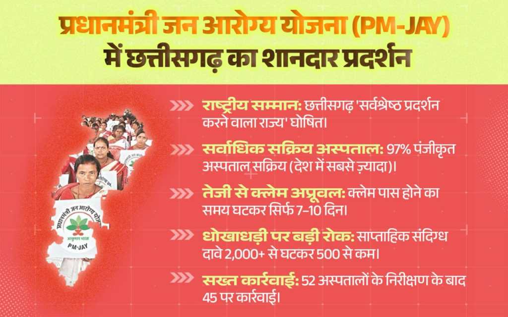 рдПрдореНрдкреИрдирд▓реНрдб рдЕрд╕реНрдкрддрд╛рд▓реЛрдВ рдХреА рд╕рдорд╕реНрдпрд╛рдУрдВ рдХреЗ рдирд┐рд░рд╛рдХрд░рдг рдХреЗ рд▓рд┐рдП рдЗрдВрдбрд┐рдпрди рдореЗрдбрд┐рдХрд▓ рдПрд╕реЛрд╕рд┐рдПрд╢рди рдХреЗ рдкреНрд░рддрд┐рдирд┐рдзрд┐рдпреЛрдВ рдФрд░ рдирд┐рдЬреА рдЕрд╕реНрдкрддрд╛рд▓реЛрдВ рдХреЗ рд╕рд╛рде рдирд┐рдпрдорд┐рдд рдмреИрдардХреЗрдВ рдЖрдпреЛрдЬрд┐рдд рдХреА рдЬрд╛ рд░рд╣реА рд╣реИрдВ. рд╣рд╛рд▓ рд╣реА рдореЗрдВ рдПрдирдПрдЪрдП рд╡рд┐рд╢реЗрд╖рдЬреНрдЮреЛрдВ рдХреА рдЙрдкрд╕реНрдерд┐рддрд┐ рдореЗрдВ рд╕реНрдЯреЗрдХрд╣реЛрд▓реНрдбрд░ рдХрдВрд╕рд▓реНрдЯреЗрд╢рди рднреА рд╣реБрдЖ. рдЬрд┐рд╕рдореЗрдВ рдЕрд╕реНрдкрддрд╛рд▓реЛрдВ рдХреА рд╕рдордпрд╛рдУрдВ рдХрд╛ рдирд┐рд░рд╛рдХрд░рдг рдХрд┐рдпрд╛ рдЧрдпрд╛, рдЙрди рд╕реЗ рд╕реБрдЭрд╛рд╡ рдкреНрд░рд╛рдкреНрдд рдХрд┐рдП рдЧрдП рдФрд░ рдЙрдиреНрд╣реЗрдВ рдпреЛрдЬрдирд╛ рдХреА рдирд╡реАрдирддрдо рдкреНрд░рдХреНрд░рд┐рдпрд╛рдУрдВ рдХреА рдЬрд╛рдирдХрд╛рд░реА рджреА рдЧрдИ. рд╕реНрд╡рд╛рд╕реНрдереНрдп рд╡рд┐рднрд╛рдЧ рдХреЗ рдЗрди рдкреНрд░рдпрд╛рд╕реЛрдВ рдХреЗ рдкрд░рд┐рдгрд╛рдорд╕реНрд╡рд░реВрдк рд╕рдВрджрд┐рдЧреНрдз рджрд╛рд╡реЛрдВ рдХреА рд╕рдВрдЦреНрдпрд╛ рдореЗрдВ рднрд╛рд░реА рдЧрд┐рд░рд╛рд╡рдЯ рдЖрдИ рд╣реИ, рдЬрд╣рд╛рдВ рдкрд╣рд▓реЗ рдкреНрд░рддрд┐ рд╕рдкреНрддрд╛рд╣ 2,000 рд╕реЗ рдЕрдзрд┐рдХ рд╕рдВрджрд┐рдЧреНрдз рджрд╛рд╡реЗ рджрд░реНрдЬ рд╣реЛрддреЗ рдереЗ. рд╡рд╣реАрдВ рдЕрдм рдпрд╣ рдШрдЯрдХрд░ 500 рд╕реЗ рднреА рдХрдо рд░рд╣ рдЧрдП рд╣реИрдВ. рд╡рд╣реАрдВ рдХреНрд▓реЗрдо рдЕрдкреНрд░реВрд╡рд▓ рдХрд╛ рд╕рдордп рдШрдЯрдХрд░ рдЕрдм рдХреЗрд╡рд▓ 7-10 рджрд┐рди рд░рд╣ рдЧрдпрд╛ рд╣реИ. рд░рд╛рд╖реНрдЯреНрд░реАрдп рд╕реНрд╡рд╛рд╕реНрдереНрдп рдкреНрд░рд╛рдзрд┐рдХрд░рдг рдХреЗ рдЖрдВрдХрдбрд╝реЛрдВ рдХреЗ рдЕрдиреБрд╕рд╛рд░, рдЫрддреНрддреАрд╕рдЧрдврд╝ рдореЗрдВ PM-JAY рдХреЗ рддрд╣рдд рдкрдВрдЬреАрдХреГрдд 97% рдЕрд╕реНрдкрддрд╛рд▓ рд╕рдХреНрд░рд┐рдп рд╣реИрдВ, рдЬреЛ рдпреЛрдЬрдирд╛ рдореЗрдВ рдЕрд╕реНрдкрддрд╛рд▓реЛрдВ рдХреЗ рд╡рд┐рд╢реНрд╡рд╛рд╕ рдХрд╛ рдкреНрд░рдорд╛рдг рд╣реИ.┬ардЬрдмрдХрд┐ рдкрдбрд╝реЛрд╕реА рдордзреНрдпрдкреНрд░рджреЗрд╢ рдореЗрдВ рдпрд╣ рджрд░ рдорд╛рддреНрд░ 62% рдФрд░┬а┬арджреЗрд╢ рдХрд╛ рдФрд╕рдд рдорд╛рддреНрд░ 52% рд╣реИ.