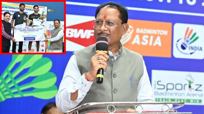 CM Trophy India International Challenge Badminton Competition 2024: मुख्यमंत्री विष्णु देव साय राजधानी रायपुर के मोवा स्थित आई स्पोर्टज बैडमिंटन अरीना में आयोजित सीएम ट्राफी इंडिया इंटरनेशनल चैलेंज बैडमिंटन स्पर्धा 2024 के समापन समारोह में शामिल हुए।