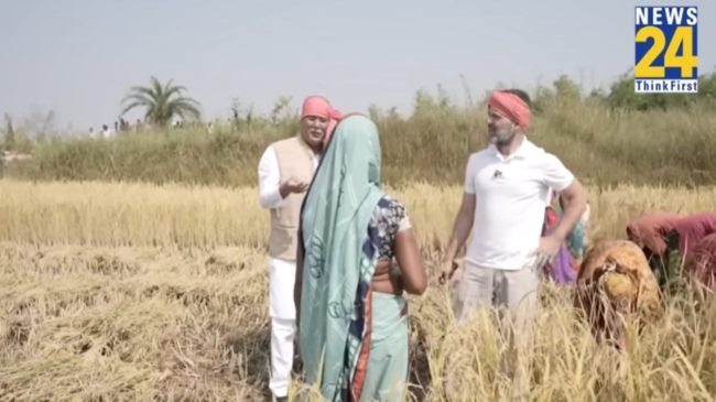 рд░рд╛рд╣реБрд▓ рдЧрд╛рдВрдзреА рд╕рд┐рд░ рдкрд░ рдЧрдордЫрд╛ рдмрд╛рдВрдз рдФрд░ рд╣рд╛рде рдореЗрдВ рд╣рд╛рд╕рд┐рдпрд╛ рд▓реЗрдХрд░ рдПрдХ рдЧреНрд░рд╛рдореАрдг рдЗрд▓рд╛рдХреЗ рдореЗрдВ рдзрд╛рди рдХреЗ рдЦреЗрдд рдореЗрдВ рдкрд╣реБрдВрдЪ рдЧрдПред рдЗрд╕ рджреМрд░рд╛рди рд╕реАрдПрдо рднреВрдкреЗрд╢ рдмрдШреЗрд▓ рднреА рдЙрдирдХреЗ рд╕рд╛рде рдереЗред рджреЛрдиреЛрдВ рдиреЗ рдХрд┐рд╕рд╛рдиреЛрдВ рд╕реЗ рдЦреБрд▓рдХрд░ рдмрд╛рдд рдХреАред рдзрд╛рди рдХреА рдлрд╕рд▓ рдХреЛ рдХрд╛рдЯрдиреЗ рдореЗрдВ рд▓рдЧреА рдорд╣рд┐рд▓рд╛рдУрдВ рд╕реЗ рдЙрдирдХреА рд╕рдорд╕реНрдпрд╛ рдЬрд╛рдиреАред рдЬрдм рд░рд╛рд╣реБрд▓ рдЧрд╛рдВрдзреА рдиреЗ рдзрд╛рди рдХреА рдлрд╕рд▓ рдХрд╛рдЯреА рддреЛ рд╡реЗ рдмреЛрд▓реЗ рдХрд┐ рдпреЗ рдПрдХ рдореБрд╢реНрдХрд┐рд▓ рдХрд╛рдо рд╣реИред рдХрд╛рдлреА рдореЗрд╣рдирдд рд╣реИред рдЗрд╕ рджреМрд░рд╛рди рджреЛрдиреЛрдВ рдиреЗрддрд╛рдУрдВ рдиреЗ рдХрд┐рд╕рд╛рдиреЛрдВ рдХреЗ рд╕рд╛рде рд╣рдВрд╕реА рдордЬрд╛рдХ рднреА рдХрд┐рдпрд╛ред