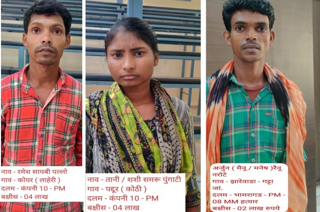 पुलिस के मुताबिक, नक्सली रमेश सायबी पल्लो लाहेरी के कोयर गांव का रहने वाला है। उसके ऊपर पुलिस ने 4 लाख रुपये का इनाम घोषित किया था। वहीं महिला नक्सली शशी समरू पुंगाटी कोठी के पद्दूर गांव की रहने वाली है। शशी के ऊपर भी पुलिस ने चार लाख रुपये का इनाम घोषित किया था। गिरफ्तार किया गया तीसरा नक्सली अर्जुन रैनू नरोटे झारेवाडा गांव का रहने वाला है। पुलिस ने इसके ऊपर दो लाख रुपये का इनाम घोषित किया था।