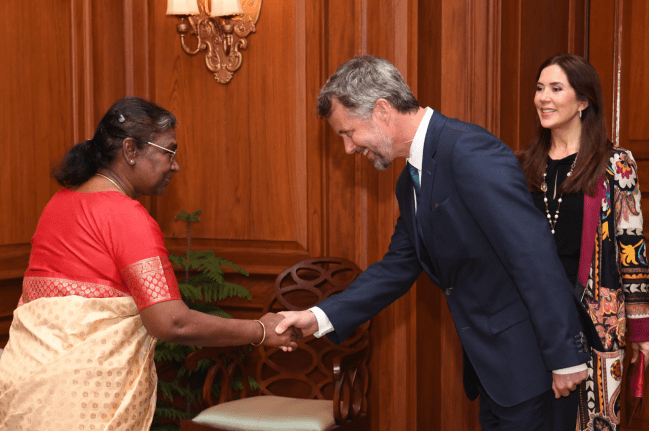 Crown Prince Frederik & Crown Princess Mary of Denmark meet President Droupadi Murmu at Rashtrapati Bhavan in Delhi.