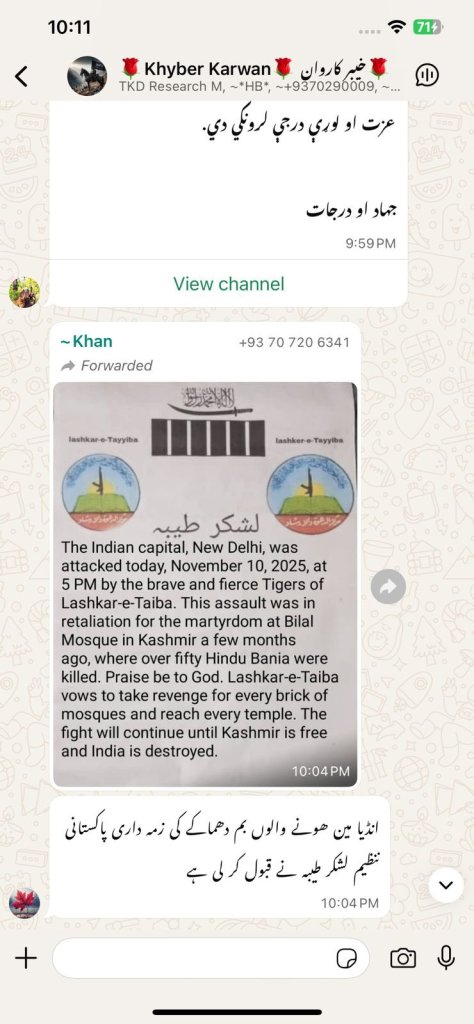 पोस्ट में लिखा है कि भारत की राजधानी नई दिल्ली पर आज, 10 नवंबर 2025, शाम 5 बजे लश्कर-ए-तैयबा के बहादुर और खूंखार टाइगर्स ने हमला किया। यह हमला कुछ महीने पहले कश्मीर की बिलाल मस्जिद में हुई शहादत का बदला लेने के लिए किया गया था, जहां 50 से ज्यादा लोग मारे गए थे। लिखा कि ईश्वर की जय हो। लश्कर-ए-तैयबा मस्जिद की हर ईंट का बदला लेने और हर मंदिर तक पहुंचने की कसम खाता है। यह लड़ाई तब तक जारी रहेगी जब तक कश्मीर आजाद नहीं हो जाता और भारत नष्ट नहीं हो जाता।