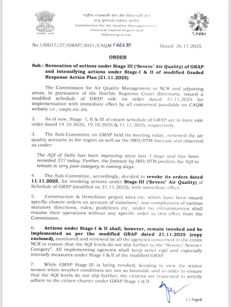 ⮚ हालांकि, GRAP के मौजूदा शेड्यूल (नवंबर 2025) के स्टेज-II और स्टेज-I के सभी प्रावधान लागू रहेंगे. संबंधित सभी एजेंसियों को निर्देश दिया जाता है कि वे इन प्रावधानों को कड़ाई से लागू करें, निगरानी बढ़ाएं और समीक्षा करते रहें ताकि आने वाले दिनों में AQI स्तर फिर से न बढ़े.