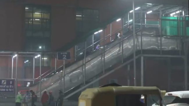 #WATCH | A thin layer of fog envelops the National Capital as the cold wave continues. Visuals from New Delhi Railway Station. pic.twitter.com/DTt1ejeAEk