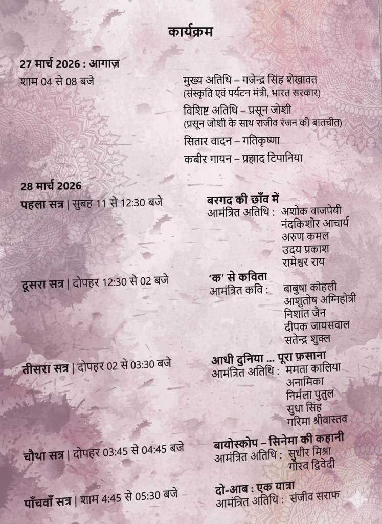 рдЗрд╕ рддреАрди рджрд┐рд╡рд╕реАрдп рд╕рд╛рд╣рд┐рддреНрдп рдЙрддреНрд╕рд╡ рдореЗрдВ рдХреЗрдВрджреНрд░реАрдп рд╕рдВрд╕реНрдХреГрддрд┐ рдПрд╡рдВ рдкрд░реНрдпрдЯрди рдордВрддреНрд░реА рдЧрдЬреЗрдВрджреНрд░ рд╕рд┐рдВрд╣ рд╢реЗрдЦрд╛рд╡рдд рдореБрдЦреНрдп рдЕрддрд┐рдерд┐ рдХреЗ рд░реВрдк рдореЗрдВ рд╢рд┐рд░рдХрдд рдХрд░реЗрдВрдЧреЗ рддрдерд╛ рдЙрджреНрдШрд╛рдЯрди рд╕рддреНрд░ рдХреА рд╢реБрд░реБрдЖрдд рдХрд░реЗрдВрдЧреЗ. рдкреНрд░рд╕рд┐рджреНрдз рдЧреАрддрдХрд╛рд░ рдФрд░ рд╕реАрдмреАрдПрдлрд╕реА рдЕрдзреНрдпрдХреНрд╖ рдкреНрд░рд╕реВрди рдЬреЛрд╢реА рд╡рд┐рд╢рд┐рд╖реНрдЯ рдЕрддрд┐рдерд┐ рдХреЗ рд░реВрдк рдореЗрдВ рдЙрдкрд╕реНрдерд┐рдд рд░рд╣реЗрдВрдЧреЗ. рд╕рд┐рдиреЗрдорд╛ рдЬрдЧрдд рд╕реЗ рд╕реБрдзреАрд░ рдорд┐рд╢реНрд░рд╛ рдФрд░ рдЪрд┐рддреНрддрд░рдВрдЬрди рддреНрд░рд┐рдкрд╛рдареА рдЬреИрд╕реЗ рдЪрд░реНрдЪрд┐рдд рдирд╛рдо рднреА рдЗрд╕рдореЗрдВ рднрд╛рдЧ рд▓реЗрдВрдЧреЗ. рд╡рд╣реАрдВ рд╡рд░рд┐рд╖реНрда рд╕рд╛рд╣рд┐рддреНрдпрдХрд╛рд░ рдЕрд╢реЛрдХ рд╡рд╛рдЬрдкреЗрдпреА, рдирдВрджрдХрд┐рд╢реЛрд░ рдЖрдЪрд╛рд░реНрдп, рдЕрд░реБрдг рдХрдорд▓, рдЙрджрдп рдкреНрд░рдХрд╛рд╢, рдордорддрд╛ рдХрд╛рд▓рд┐рдпрд╛ рдФрд░ рдЕрдирд╛рдорд┐рдХрд╛ рд╕рд╣рд┐рдд рдпреБрд╡рд╛ рд░рдЪрдирд╛рдХрд╛рд░ рднреА рдЕрдкрдиреА рдЙрдкрд╕реНрдерд┐рддрд┐ рджрд░реНрдЬ рдХрд░рд╛рдПрдВрдЧреЗ. рдпреЗ рд╕рднреА рд╣рд╕реНрддрд┐рдпрд╛рдВ рд╕рдордХрд╛рд▓реАрди рд╕рд╛рд╣рд┐рддреНрдп, рдХрд▓рд╛ рдПрд╡рдВ рд╕рдВрд╕реНрдХреГрддрд┐ рдХреЗ рд╕рдВрд╡рд╛рдж рдХреЛ рд╕рдореГрджреНрдз рдХрд░реЗрдВрдЧреА рдФрд░ рдХрд╛рд░реНрдпрдХреНрд░рдо рдХреА рд╢реЛрднрд╛ рдмрдврд╝рд╛рдПрдВрдЧреА.