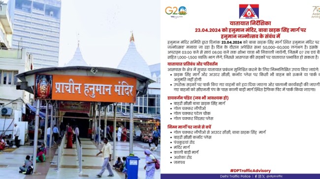---рд╡рд┐рдЬреНрдЮрд╛рдкрди---In view of celebration of Hanuman Janmotsav at Hanuman Mandir, Baba Kharak Singh Marg on 23.04.2024, traffic restrictions and diversions will be effective.#DPTrafficAdvisory pic.twitter.com/auTKjj9VgP