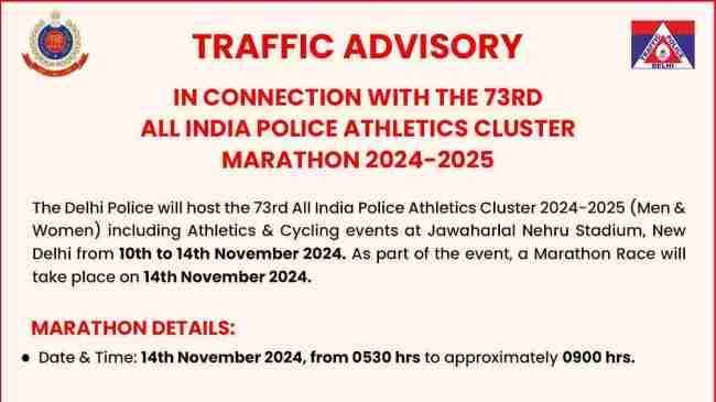 दिल्ली ट्रैफिक पुलिस के अनुसार 14 नवंबर को सुबह 5.30 बजे जेएलएन स्टेडियम से 73वीं अखिल भारतीय पुलिस एथलेटिक्स क्लस्टर मैराथन 2024-2025 शुरू होगी। जिसके चलते मेहरचंद मार्केट सिग्नल, कोटला रेड लाइट और एंड्रयूज गंज फ्लाईओवर से ट्रैफिक डायवर्ट किया गया है। मैराथन रूट के आसपास ट्रैफिक बाधित रहेगा।