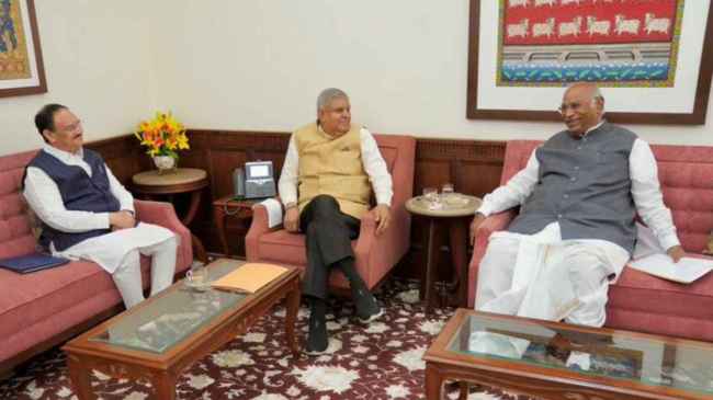 जगदीप धनकड़ ने कहा कि विपक्ष के नेता खड़गे की ओर से सुझाव सामने आया कि संसदीय परंपराओं के अनुरूप इस विषय पर सदन के फ्लोर लीडर्स के साथ चर्चा की जानी चाहिए। इस सुझाव को हम तीनों की पूरी सहमति प्राप्त हुई है। इसलिए एक बैठक बुलाई जाएगी जिसमें मैं राज्यसभा के फ्लोर लीडर्स को आमंत्रित करूंगा, ताकि इस मुद्दे पर आगे निर्णय लिया जा सके।