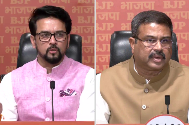 Rahul Gandhi Issue: राहुल गांधी की लोकसभा सदस्यता रद्द होने के बाद सियासत तेज है। शुक्रवार को कांग्रेस ने मोदी सरकार पर राहुल गांधी की आवाज को दबाने का आरोप लगाया। इसके बाद भाजपा भी सामने आई। केंद्रीय मंत्री अनुराग ठाकुर और धर्मेंद्र प्रधान ने प्रेस कॉन्फ्रेंस कर कांग्रेस और राहुल गांधी पर पलटवार किया है।