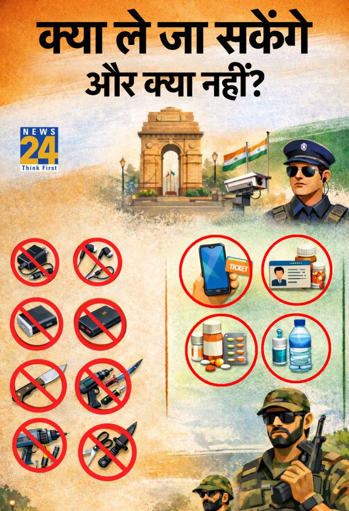 बता दें कि 26 जनवरी को कर्तव्य पथ पर आएं तो मोबाइल चार्जर, इयरफोन, पावर बैंक, बैटरी से चलने वाले गैजेट, हथौड़ा, औजार, रेजर, ब्लेड, चाकू, नुकील हथियार, कैंची और तार लेकर न आंए. ड्रिल, आरी, तलवार, कटार और पेंचकस जैसी चीजें भी नहीं होनी चाहिए. अगर इनमें से कोई चीज मिली तो परेड नहीं देख पाएंगे और कानूनी कार्रवाई भी हो सकती है. VVIP मूवमेंट के चलते कर्तव्य पथ के आस-पास हाई सिक्योरिटी रहेगी, इसलिए मोबाइल फोन, टिकट, फोटो ID और जरूरी दवा-पानी की छोटी बोतल साथ ले जा सकते हैं.