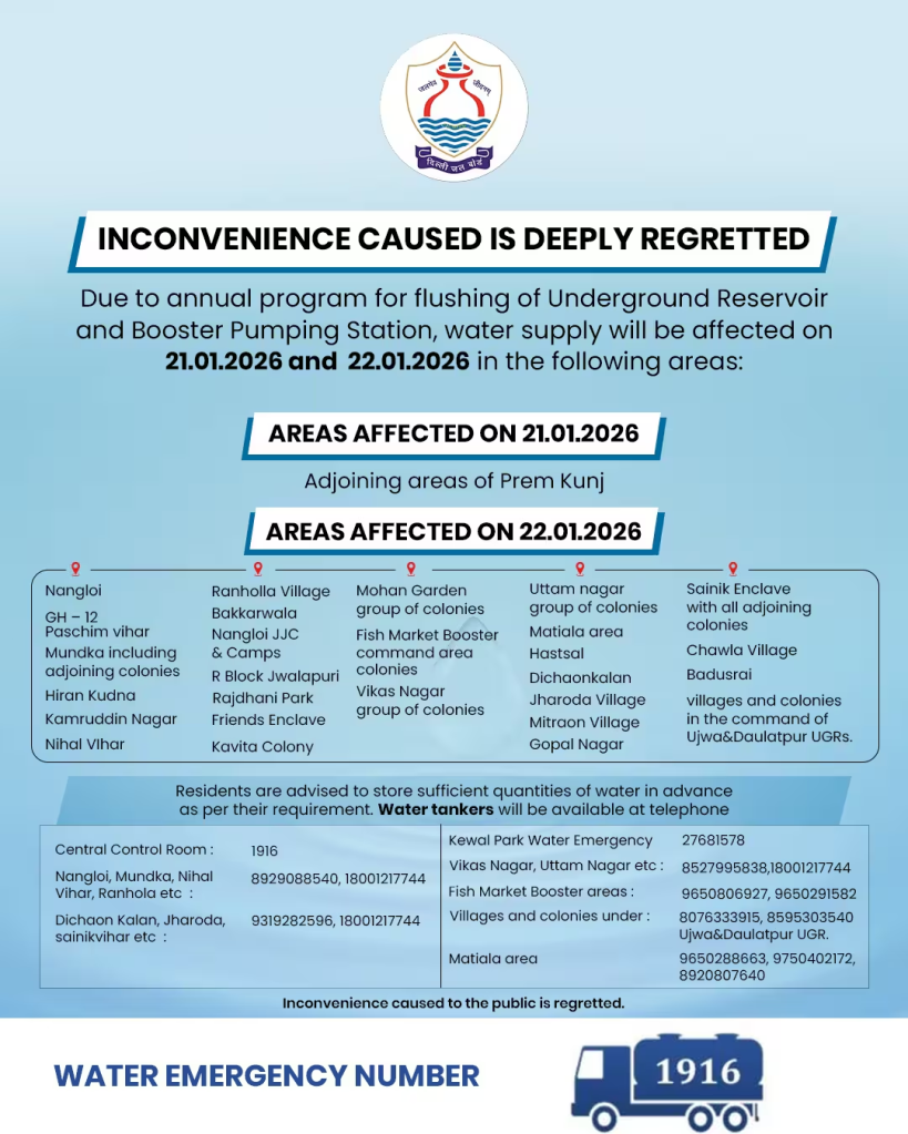 рд╕рд╛рде рд╣реА, рдЯреИрдВрдХрд░ рд╕реБрд╡рд┐рдзрд╛ рдХреЗ рд▓рд┐рдП рд╡рд┐рднрд┐рдиреНрди рд╣реЗрд▓реНрдкрд▓рд╛рдЗрди рдирдВрдмрд░ рднреА рд╕рд╛рдЭрд╛ рдХрд┐рдП рдЧрдП рд╣реИрдВ, рдЬрд┐рди рдкрд░ рд╕рдВрдкрд░реНрдХ рдХрд░ рддрддреНрдХрд╛рд▓ рд╕рд╣рд╛рдпрддрд╛ рд▓реА рдЬрд╛ рд╕рдХреЗрдЧреА. рджрд┐рд▓реНрд▓реА рдЬрд▓ рдмреЛрд░реНрдб рдХреЗ рдЕрдиреБрд╕рд╛рд░, рдмреБрдзрд╡рд╛рд░ (21 рдЬрдирд╡рд░реА) рдХреЛ рдореБрдЦреНрдп рд░реВрдк рд╕реЗ рдкреНрд░реЗрдо рдХреБрдВрдЬ рддрдерд╛ рдЙрд╕рдХреЗ рдЖрд╕рдкрд╛рд╕ рдХреЗ рдХреНрд╖реЗрддреНрд░ рдкреНрд░рднрд╛рд╡рд┐рдд рд╣реЛрдВрдЧреЗ.