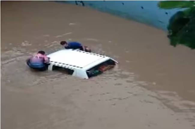 सोशल मीडिया पर वायरल हुए वीडियो में कार सवारों को अपनी कार से बचने के लिए संघर्ष करते देखा जा सकता है। वीडियो में केवल कार की छत देखी जा सकती है, जो पूरी तरह से पानी में डूबी हुई है।
