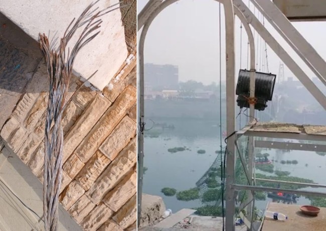 рдлреЛрдЯреЛ рдореЗрдВ рд▓реЛрд╣реЗ рдХрд╛ рдПрдХ рдЯреВрдЯрд╛ рддрд╛рд░ рджрд┐рдЦ рд░рд╣рд╛ рд╣реИред рдХрд╣рд╛ рдЬрд╛ рд░рд╣рд╛ рд╣реИ рдХрд┐ рдпрд╣ рд╡реЛ рддрд╛рд░ рд╣реИ рдЬрд┐рд╕рд╕реЗ рдкреБрд▓ рдХреЛ рдирджреА рдХреЗ рджреЛрдиреЛрдВ рдЫреЛрд░ рд╕реЗ рдЬреЛрдбрд╝рд╛ рдЧрдпрд╛ рдерд╛ред рдкреБрд▓ рдкрд░ рдЕрдзрд┐рдХ рд▓реЛрдЧреЛрдВ рдХреЗ рднрд╛рд░ рд╣реЛрдиреЗ рдХреЗ рдЪрд▓рддреЗ рдпреЗ рддрд╛рд░ рдЯреВрдЯ рдЧрдпрд╛ рдЬрд┐рд╕рд╕реЗ рдкреБрд▓ рдирджреА рдореЗрдВ рдЬрд╛ рдЧрд┐рд░рд╛ред