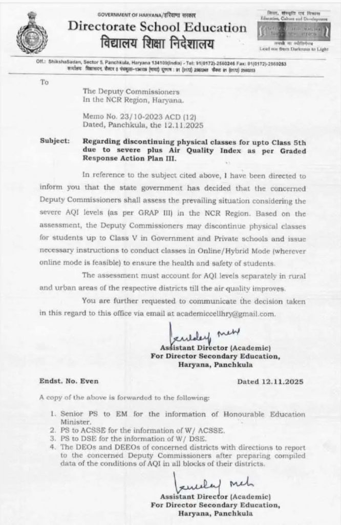 Haryana News: рд░рд╛рдЬрдзрд╛рдиреА рджрд┐рд▓реНрд▓реА рд╕рд╣рд┐рдд рдПрдирд╕реАрдЖрд░ рдХреЗ рдЬрд┐рд▓реЛрдВ рдореЗрдВ рдкрд┐рдЫрд▓реЗ рджрд┐рдиреЛрдВ рд╕реЗ рд▓рдЧрд╛рддрд╛рд░ рдмрдврд╝рддреЗ рдкреНрд░рджреВрд╖рдг рдХреЛ рджреЗрдЦрддреЗ рд╣реБрдП рд╣рд░рд┐рдпрд╛рдгрд╛ рд╕рд░рдХрд╛рд░ рдиреЗ рдмрдбрд╝рд╛ рдлреИрд╕рд▓рд╛ рд▓рд┐рдпрд╛ рд╣реИ. рд▓рдЧрд╛рддрд╛рд░ рдмрдврд╝рддреЗ рдкреНрд░рджреВрд╖рдг рдХреЗ рдХрд╛рд░рдг рдПрдирд╕реАрдЖрд░ рдореЗрдВ рдЧреНрд░реЗрдбреЗрдб рд░рд┐рд╕реНрдкрд╛рдВрд╕ рдПрдХреНрд╢рди рдкреНрд▓рд╛рди (GRAP) рдХрд╛ рддреАрд╕рд░рд╛ рдЪрд░рдг рд▓рд╛рдЧреВ рдХрд┐рдпрд╛ рдЧрдпрд╛ рд╣реИ. рдЬрд┐рд╕рдХреЗ рдмрд╛рдж рд╕рд░рдХрд╛рд░ рдХреА рдУрд░ рд╕реЗ рдмрдврд╝рддреЗ рдПрдХреНрдпреВрдЖрдИ рдХреЛ рд▓реЗрдХрд░ рдХрдХреНрд╖рд╛ 5 рддрдХ рдХреА рдХрдХреНрд╖рд╛рдУрдВ рдХреЗ рд▓рд┐рдП рд╕реНрдХреВрд▓ рдмрдВрдж рдХрд┐рдпрд╛ рдЧрдпрд╛ рд╣реИ. рд╣рд░рд┐рдпрд╛рдгрд╛ рдХреЗ рдорд╛рдзреНрдпрдорд┐рдХ рд╢рд┐рдХреНрд╖рд╛ рдирд┐рджреЗрд╢рд╛рд▓рдп рджреНрд╡рд╛рд░рд╛ рдЗрд╕ рдЖрджреЗрд╢ рдХреЗ рдкрд╛рд▓рди рдХреЗ рд▓рд┐рдП рд╕рднреА рдЙрдкрд╛рдпреБрдХреНрддреЛрдВ рдХреЛ рдирд┐рд░реНрджреЗрд╢ рджрд┐рдпрд╛ рдЧрдпрд╛ рд╣реИ.