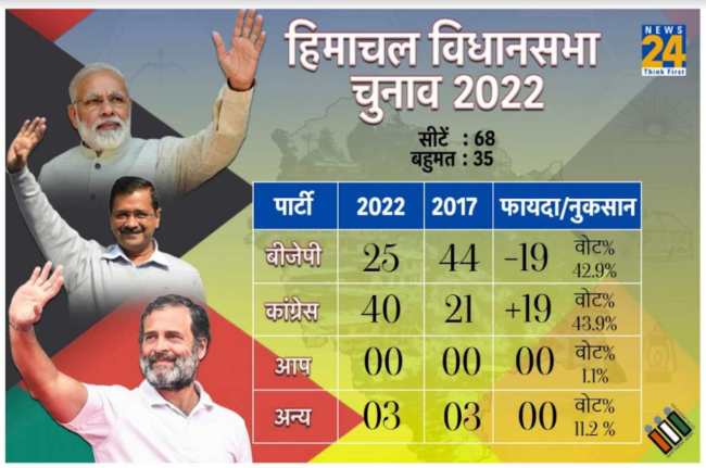 हिमाचल प्रदेश में न्यूज-24 और टुडेज चाणक्या एग्जिट पोल के मुताबिक भाजपा और कांग्रेस में कांटे की टक्कर है। देवभूमि में भाजपा और कांग्रेस को 33-33 सीटें मिलती दिखीं। जबकि एग्जिट पोल में आम आदमी पार्टी को अभी लंबा इंतजार करना पड़ता नजर आ रहा है। 12 नवंबर को एक चरण का मतदान हुआ। प्रदेश की जनता ने अपने-अपने नेता का भविष्य तय करने के लिए EVM का बटन दबाया।