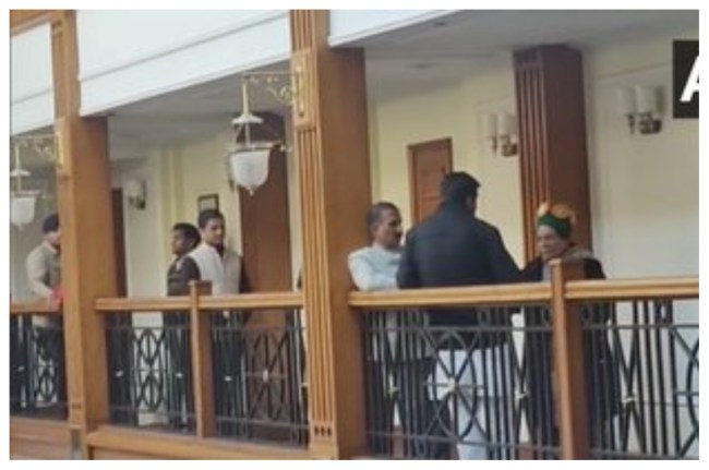 Himachal Pradesh Congress chief Pratibha Virbhadra Singh, Congress leader Sukhvinder Singh Sukhu and other party leaders interact with each other ahead of the Congress Legislature Party meeting. pic.twitter.com/c7dNluIvVW