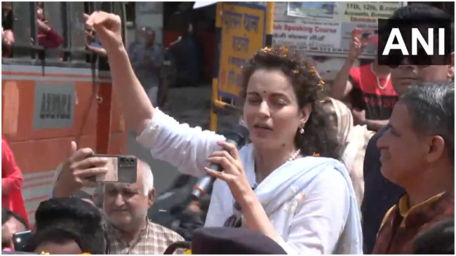#WATCH | Lok Sabha elections 2024 | Himachal Pradesh: BJP candidate from Mandi and actor Kangana Ranaut addresses people as she conducts a road show here.