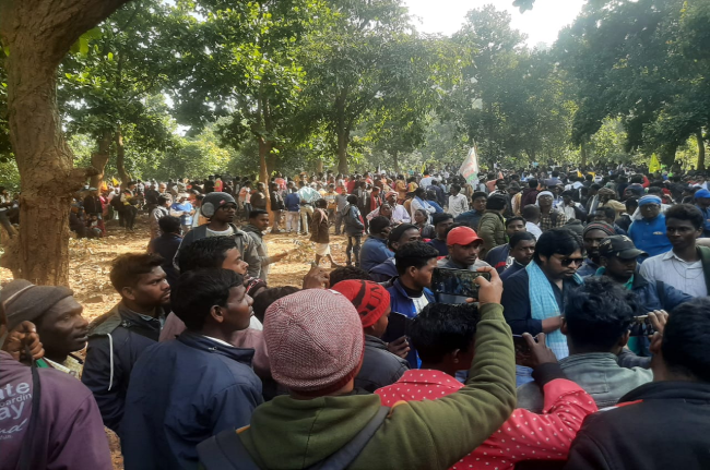 विवेक चन्द्र, मधुबन: सम्मेद शिखर पर दावे को लेकर मंगलवार को आदिवासी समाज प्रदर्शन कर रहा है। पूरे इलाके में भारी पुलिस बल तैनात किया गया है। संथाल समाज के लोग हाथों में तीर-धनुष लेकर सड़कों पर उतर चुके हैं। पुलिस ने पारसनाथ पहाड़ के आसपास की दुकानों को बंद कराया है। लोग सभा स्थल पर नारेबाजी करते हुए पहुंच रहे हैं। संथाल स्थानीय विधायक सुदीप्त सोनू और मुख्यमंत्री हेमंत सोरेन के प्रति नाराजगी जाहिर कर रहे हैं। सूत्रों के अनुसार समुदाय के लोग पूजा कर फुटबॉल ग्राउंड में जमा होंगे और वहां सभा करेंगे।