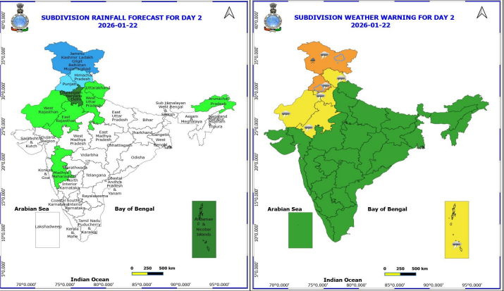 рднрд╛рд░рддреАрдп рдореМрд╕рдо рд╡рд┐рдЬреНрдЮрд╛рди рд╡рд┐рднрд╛рдЧ (IMD) рдХреЗ рдЕрдиреБрд╕рд╛рд░ 22 рдФрд░ 23 рдЬрдирд╡рд░реА рдХреЛ рдЬрдореНрдореВ-рдХрд╢реНрдореАрд░-рд▓рджреНрджрд╛рдЦ, 23 рдЬрдирд╡рд░реА рдХреЛ рд╣рд┐рдорд╛рдЪрд▓ рдкреНрд░рджреЗрд╢ рдФрд░ рдЙрддреНрддрд░рд╛рдЦрдВрдб рдХреЗ рдХрд╛рдлреА рдмрдбрд╝реЗ рдЗрд▓рд╛рдХреЗ рдореЗрдВ рдмрд╛рд░рд┐рд╢ рдФрд░ рдмрд░реНрдлрдмрд╛рд░реА рд╣реЛрдЧреА. 23 рдЬрдирд╡рд░реА рдХреЛ рдкрдВрдЬрд╛рдм рдореЗрдВ рдХрд╛рдлреА рдмрдбрд╝реЗ рдЗрд▓рд╛рдХреЗ рдореЗрдВ рд╣рд▓реНрдХреА рд╕реЗ рдордзреНрдпрдо рдмрд╛рд░рд┐рд╢ рд╣реЛрдиреЗ рдХреА рд╕рдВрднрд╛рд╡рдирд╛ рд╣реИ. 22 рдФрд░ 23 рдЬрдирд╡рд░реА рдХреЛ рдкрдВрдЬрд╛рдм рдореЗрдВ рдЧрд░рдЬ-рдЪрдордХ рдХреЗ рд╕рд╛рде рдУрд▓рд╛рд╡реГрд╖реНрдЯрд┐, рдмрд┐рдЬрд▓реА рдХрдбрд╝рдХрдиреЗ рдФрд░ 50-60 рдХрд┐рдореА рдкреНрд░рддрд┐ рдШрдВрдЯрд╛ рдХреА рд░рдлреНрддрд╛рд░ рд╕реЗ рддреЗрдЬ рд╣рд╡рд╛рдПрдВ рдЪрд▓рдиреЗ рдХреА рд╕рдВрднрд╛рд╡рдирд╛ рд╣реИ, 23 рдЬрдирд╡рд░реА рдХреЛ рд╣рд░рд┐рдпрд╛рдгрд╛, рдЪрдВрдбреАрдЧрдврд╝ рдФрд░ рджрд┐рд▓реНрд▓реА рдореЗрдВ, рдЬрдореНрдореВ-рдХрд╢реНрдореАрд░-рд▓рджреНрджрд╛рдЦ, рдкрдВрдЬрд╛рдм рдореЗрдВ 22 рдФрд░ 23 рдЬрдирд╡рд░реА рдХреЛ рдУрд▓рд╛рд╡реГрд╖реНрдЯрд┐, рдмрд┐рдЬрд▓реА рдХрдбрд╝рдХрдиреЗ рдФрд░ 50-60 рдХрд┐рдореА рдкреНрд░рддрд┐ рдШрдВрдЯрд╛ рдХреА рд░рдлреНрддрд╛рд░ рд╕реЗ рддреЗрдЬ рд╣рд╡рд╛рдПрдВ рдЪрд▓рдиреЗ рдХреА рд╕рдВрднрд╛рд╡рдирд╛ рд╣реИ.
