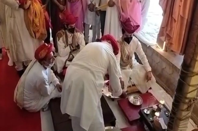 ज्योतिरादित्य सिंधिया और उनके बेटे महान आर्यमन राजशाही पोशाक पहनकर सबसे पहले गोरखी स्थित देव घर पहुंचे। यहां उनकी रियासत कालीन परंपरा के तहत शहनाईयों के बीच अगवानी की गई। पूजा के लिए ज्योतिरादित्य सिंधिया और महान आर्यमन तलवार हाथ में लेकर देवघर पहुंचे।