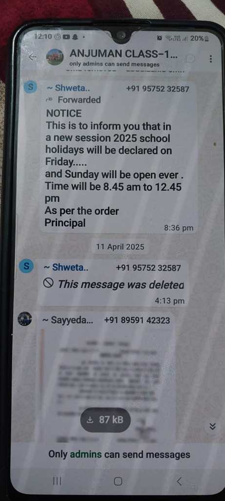 दरअसल जबलपुर के मालवीय चौक इलाके में सालों से संचालित अंजुमन इस्लामिया इंग्लिश मीडियम स्कूल की तरफ से नए सत्र को लेकर एक नया आदेश जारी किया है। जिसमें लिखा है कि नए सत्र 2025-26 से स्कूल शुक्रवार को बंद रहेगा और रविवार को खुलेगा। ये मैसेज स्कूल प्रबंधन के ग्रुप में जुड़े बच्चों के अभिभावकों के मोबाइल पर भेजे गए हैं।