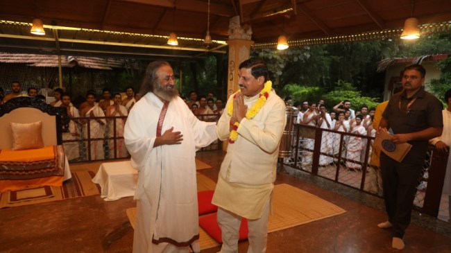 यहां मुख्यमंत्री डॉ. यादव ने कहा कि दुनिया में कई देश हैं, जो आगे तो बढ़ना चाहते हैं, पर कोई किसी को लूटना चाहता है तो कोई दबाना चाहता है। दुनिया में हमारी ही संस्कृति है, जो हमें विश्व गुरु बनने की ओर ले जाती है। जीवन में कभी अवसाद आ जाए और गुरु जी को याद कर लो कष्ट चला जाता है। ऐसी कला गुरुजी सिखाते हैं। श्रीश्री रविशंकर ने मुख्यमंत्री डॉ. यादव से बातचीत के दौरान प्रदेश में राज्य सरकार द्वारा गोसंरक्षण की दिशा में किए जा रहे प्रयासों की प्रशंसा की। मुख्यमंत्री डॉ. यादव ने प्रदेश की खुशहाली और उन्नति के लिए श्रीश्री रविशंकर से मार्गदर्शन प्राप्त किया।