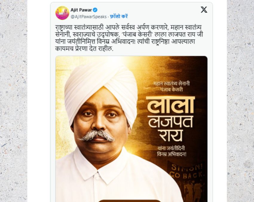 अजित पवार का आखिरी पोस्ट बुधवार यानी 28 जनवरी को 8 बजकर 57 मिनट पर था, जिसे एक्स पर किया था. इस पोस्ट में उन्होंने महान स्वतंत्रता सेनानी लाला लाजपत राय को उनकी जयंती पर याद किया था. उन्होंने लाला लाजपत राय जी को उनकी जयंती पर विनम्र श्रद्धांजलि दी थी. महान स्वतंत्रता सेनानी के बारे में पोस्ट करते हुए उन्होंने लाला लाजपत राय जी की कुर्बानी को भी याद किया था.