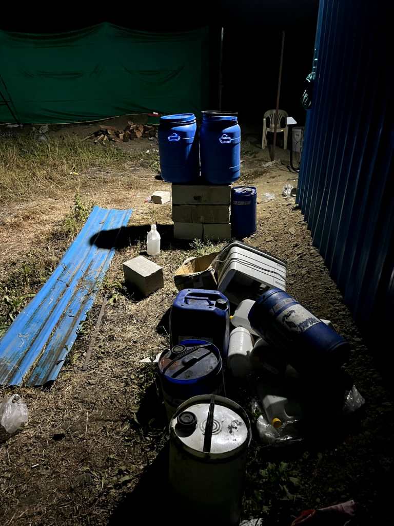 यह अवैध फैक्ट्री ग्रामीण परिवेश में घुल-मिल जाने और जांच एजेंसियों की नजर से बचने के उद्देश्य से स्थानीय व्यक्तियों द्वारा जानबूझकर एक अस्थायी, मॉड्यूलर और बिना पहचान वाली संरचना के रूप में तैयार की गई थी. यह पूरी यूनिट झाड़ियों के बीच गहराई में छिपाकर संचालित की जा रही थी.