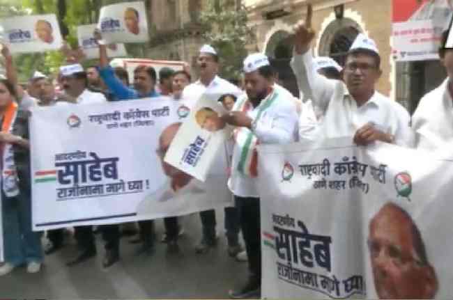 #WATCH | NCP workers raise slogans in support of NCP chief Sharad Pawar, outside the party office in Mumbai.