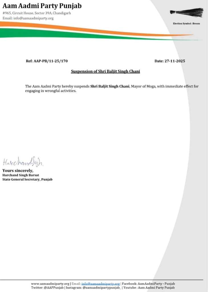 मोगा के मेयर बलजीत सिंह चीनी को आम आदमी पार्टी ने सस्पेंड कर दिया है. मिली जानकारी के अनुसार, मोगा मेयर को नशा तस्करों से संबंधों के चलते आम आदमी पार्टी ने पार्टी से निकाल दिया है. बता दें कि मोगा मेयर को पद से भी हटाया गया है. मोगा मेयर के नशा तस्करों के साथ संबंध के भी पुख्ता सबूत सामने आए हैं. जिसके बाद पार्टी ने एक्शन लिया है.