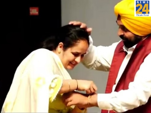 #WATCH | Amritsar: Punjab CM Bhagwant Mann stopped his speech midway as a woman came to the stage to tie him rakhi