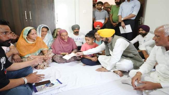 рд╕реАрдПрдо рдорд╛рди рдиреЗ рд╢рд╣реАрдж рдХреЗ рдкрд░рд┐рд╡рд╛рд░ рдХреЛ рдПрдХ рдХрд░реЛрдбрд╝ рд░реБрдкрдпреЗ рдХрд╛ рд╕реМрдВрдкрддреЗ рд╣реБрдП рдХрд╣рд╛ рдХрд┐ рдкрдВрдЬрд╛рдм рдХреА рдпреЗ рд╡реАрд░ рд╕рдкреВрдд рдорд╛рддреГрднреВрдорд┐ рдХреА рд╕реЗрд╡рд╛ рдХрд░рддреЗ рд╣реБрдП рдмрд▓рд┐рджрд╛рди рд╣реЛ рдЧрдпрд╛ред рд╕реАрдПрдо рдорд╛рди рдиреЗ рдмрддрд╛рдпрд╛ рдХрд┐ рдЪреБрдирд╛рд╡ рдХреЛ рд▓реЗрдХрд░ рд▓рд╛рдЧреВ рд╣реБрдП рдЖрдЪрд╛рд░ рд╕рдВрд╣рд┐рддрд╛ рдХреЗ рдХрд╛рд░рдг рд╡рд╣ рдкреАрдбрд╝рд┐рдд рдкрд░рд┐рд╡рд╛рд░ рдорд┐рд▓рдиреЗ рдирд╣реАрдВ рдЖ рдкрд╛рдП рдФрд░ рд╡рд╛рджреЗ рдХреЗ рдЕрдиреБрд╕рд╛рд░ рдЙрдиреНрд╣реЗрдВ рдПрдХ рдХрд░реЛрдбрд╝ рд░реБрдкрдпреЗ рдХрд╛ рдЪреЗрдХ рджреЗ рдкрд╛рдПрдВред рдЬреИрд╕реЗ рд╣реА рдЖрдЪрд╛рд░ рд╕рдВрд╣рд┐рддрд╛ рдЦрддреНрдо рд╣реБрдИ рд╡реИрд╕реЗ рд╣реА рдЙрдиреНрд╣реЛрдВрдиреЗ рдмрд┐рдирд╛ рдЬреНрдпрд╛рджрд╛ рд╕рдордп рдЧрдВрд╡рд╛рдП рдЦреБрдж рд╢рд╣реАрдж рдХреЗ рдкрд░рд┐рд╡рд╛рд░ рд╕реЗ рдорд┐рд▓реЗ рдФрд░ рдЕрдкрдирд╛ рд╡рд╛рджрд╛ рдкреВрд░рд╛ рдХрд┐рдпрд╛ред