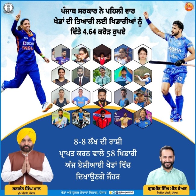 рдореАрдд рд╣реЗрдпрд░ рдиреЗ рдХрд╣рд╛ рдХрд┐ рдкрдВрдЬрд╛рдм рдХреЗ рдореБрдЦреНрдпрдордВрддреНрд░реА рд╕реАрдПрдо рднрдЧрд╡рдВрдд рд╕рд┐рдВрд╣ рдорд╛рди рдХреЗ рдирд┐рд░реНрджреЗрд╢реЛрдВ рдкрд░ рдмрдирд╛рдИ рдирдпреА рдЦреЗрд▓ рдиреАрддрд┐ рднреА рдПрд╢рд┐рдпрд╛рдИ рдЦреЗрд▓реЛрдВ рд╕реЗ рдЬрд╝рдореАрдиреА рд╕реНрддрд░ рдкрд░ рд▓рд╛рдЧреВ рд╣реЛ рдЧрдИ рд╣реИ рдФрд░ рдЗрди рдЦреЗрд▓реЛрдВ рдореЗрдВ рд╣рд┐рд╕реНрд╕рд╛ рд▓реЗрдиреЗ рдЬрд╛ рд░рд╣реЗ рдкрдВрдЬрд╛рдм рдХреЗ 58 рдЦрд┐рд▓рд╛рдбрд╝реА рдкреНрд░рддрд┐ рдЦрд┐рд▓рд╛рдбрд╝реА 8 рд▓рд╛рдЦ рд░реБрдкрдП рдХреЗ рд╣рд┐рд╕рд╛рдм рдХреЗ рд╕рд╛рде рдХреБрд▓ 4.64 рдХрд░реЛрдбрд╝ рд░реБрдкрдП рджрд┐рдП рдЧрдПред рдкрд╣рд▓реА рдмрд╛рд░ рдЦрд┐рд▓рд╛рдбрд╝рд┐рдпреЛрдВ рдХреЛ рддреИрдпрд╛рд░реА рдХреЗ рд▓рд┐рдП рдирдХрдж рдЗрдирд╛рдо рд░рд╛рд╢рд┐ рджреЗрдиреЗ рдХреА рд╢реБрд░реБрдЖрдд рдХреА рдЧрдИ рд╣реИред рдЦреЗрд▓ рдордВрддреНрд░реА рдиреЗ рдЦрд┐рд▓рд╛рдбрд╝рд┐рдпреЛрдВ рдХреЛ рд╣реМрд╕рд▓рд╛ рдЕрдлрдЬрд╝рд╛рдпреА рдХреЗ рд▓рд┐рдП рдирдХрдж рдЗрдирд╛рдо рд░рд╛рд╢рд┐ рджреЗрдиреЗ рдХреЗ рд▓рд┐рдП рдореБрдЦреНрдпрдордВрддреНрд░реА рдХрд╛ рд╡рд┐рд╢реЗрд╖рддрдГ рдзрдиреНрдпрд╡рд╛рдж рдХрд┐рдпрд╛, рдЬрд┐рдирдХреЗ рдХрд╛рд░рдг рдкрдВрдЬрд╛рдм рдЦреЗрд▓ рдХреА рддреИрдпрд╛рд░реА рдХреЗ рд▓рд┐рдП рдирдХрдж рд░рд╛рд╢рд┐ рджреЗрдиреЗ рд╡рд╛рд▓рд╛ рдкрд╣рд▓рд╛ рд░рд╛рдЬреНрдп рдмрдирд╛ред рдЙрдиреНрд╣реЛрдВрдиреЗ рдХрд╣рд╛ рдХрд┐ рдПрд╢рд┐рдпрд╛рдИ рдЦреЗрд▓реЛрдВ рдореЗрдВ рд╕реНрд╡рд░реНрдг, рд░рдЬрдд рдФрд░ рдХрд╛рдВрд╕реНрдп рдкрджрдХ рдЬреАрддрдиреЗ рд╡рд╛рд▓реЗ рдкрдВрдЬрд╛рдмреА рдЦрд┐рд▓рд╛рдбрд╝рд┐рдпреЛрдВ рдХреЛ рдЗрдирд╛рдо рд░рд╛рд╢рд┐ рдХреЗ рддреМрд░ рдкрд░ рдХреНрд░рдорд╡рд╛рд░ рдПрдХ рдХрд░реЛрдбрд╝ рд░реБрдкрдП, 75 рд▓рд╛рдЦ рдФрд░ 50 рд▓рд╛рдЦ рд░реБрдкрдП рдорд┐рд▓реЗрдВрдЧреЗред