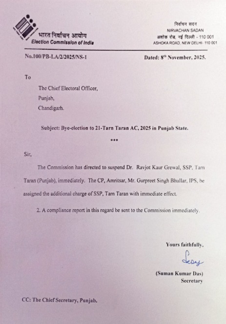 рдЪреБрдирд╛рд╡ рдЖрдпреЛрдЧ рдХреЗ рдирд┐рд░реНрджреЗрд╢ рдореЗрдВ рдХрд╣рд╛ рдЧрдпрд╛ рд╣реИ рдХрд┐ рдЕрдореГрддрд╕рд░ рдХреЗ рдкреБрд▓рд┐рд╕ рдХрдорд┐рд╢реНрдирд░ рдЧреБрд░рдкреНрд░реАрдд рд╕рд┐рдВрд╣ рднреБрд▓реНрд▓рд░ рдХреЛ рддрд░рди рддрд╛рд░рди SSP рдХрд╛ рдЕрддрд┐рд░рд┐рдХреНрдд рдЪрд╛рд░реНрдЬ рджрд┐рдпрд╛ рдЧрдпрд╛ рд╣реИ. рдпрд╣ рдШреЛрд╖рдгрд╛ 11 рдирд╡рдВрдмрд░ рдХреЛ рд╣реЛрдиреЗ рд╡рд╛рд▓реЗ рддрд░рди рддрд╛рд░рди рд╡рд┐рдзрд╛рдирд╕рднрд╛ рдЙрдкрдЪреБрдирд╛рд╡ рд╕реЗ рддреАрди рджрд┐рди рдкрд╣рд▓реЗ рд╣реБрдИ рд╣реИ.
