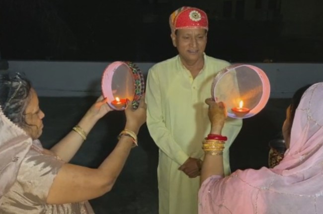 आपको बता दे कि उदयपुर सांसद अर्जुन लाल मीणा की दो पत्नियां है और दोनों साथ ही रहती है। एक का नाम राजकुमारी मीणा है जो एक अध्यापिका है वही दूसरी मीना, जो एक गृहणी है। राजकुमारी और मीना दोनों बहनें भी है। आज करवा चौथ के अवसर पर दोनों ने कथा सुनी व चांद निकलने पर अपने पति सांसद अर्जुन मीणा को परम्परा अनुसार तिलक लगाकर मिठाई खिलाई और आरती के बाद दोनों ने छलनी से अपने चांद रूपी पति मीणा के दर्शन किये।
