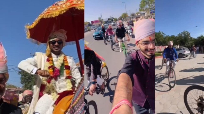 Groom Took Out Baraat on Bicycle in Jodhpur: आज तक आपने कई शादियां देखी होंगी, जिसमें दूल्हा हेलीकॉप्टर, लग्जरी कार, घोड़ा गाड़ी या फिर घोड़े पर सवार होकर अपनी दुल्हन के घर बारात लेकर जाता है। वहीं, बाराती दूल्हे की शान को बढ़ाते दिखाई देते हैं। हाल ही में जोधपुर में एक ऐसी शादी देखने को मिली, जिसमें दूल्हे से लेकर बाराती तक सभी लोग साइकिल पर सवार होकर दुल्हन के घर पहुंचे। इस अनोखी बारात का एक वीडियो भी सामने आया है, जो सोशल मीडिया पर तेजी से वायरल हो रहा है।