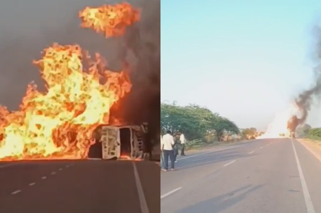 рдЬрд╛рдирдХрд╛рд░реА рдХреЗ рдореБрддрд╛рдмрд┐рдХ рд╣рд╛рдЗрд╡реЗ рдкрд░ рдкрд▓рдЯрдиреЗ рд╕реЗ рдЯреЗрдВрдХрд░ рдореЗрдВ рдЖрдЧ рд▓рдЧ рдЧрдИ рддрдерд╛ рдХреЗрдорд┐рдХрд▓ рдмрд╣рдХрд░ рд╕рдбрд╝рдХ рдХрд┐рдирд╛рд░реЗ рдмрд╣рдиреЗ рд▓рдЧрд╛, рдЬрд┐рд╕рд╕реЗ рдЖрдЧ рд╕рдбрд╝рдХ рдХрд┐рдирд╛рд░реЗ-рдХрд┐рдирд╛рд░реЗ рднреА рд▓рдЧ рдЧрдИред рдЯреЗрдВрдХрд░ рд╕рдбрд╝рдХ рдХреЗ рдмреАрдЪ рдкрд▓рдЯрдиреЗ рд╕реЗ рд░рд╛рд╕реНрддрд╛ рдЬрд╛рдо рд╣реЛ рдЧрдпрд╛ рддрдерд╛ рджреЛрдиреЛрдВ рддрд░рдл рд╡рд╛рд╣рдиреЛрдВ рдХреА рд▓рдореНрдмреА рдХрддрд╛рд░реЗрдВ рд▓рдЧ рдЧрдИред рдкреБрд▓рд┐рд╕ рдиреЗ рджрдордХрдо рдХреЛ рдореМрдХреЗ рдкрд░ рдмреБрд▓рд╛рдпрд╛, рдЖрдЧ рдХрд╛ рд╡рд┐рдХрд░рд╛рд▓ рд░реВрдк рд╣реЛрдиреЗ рд╕реЗ рдЖрдЧ рдмреБрдЭрд╛рдиреЗ рдореЗрдВ рдмреЬреА рдорд╢рдХреНрдХрдд рдХрд░рдиреА рдкреЬреАред рдХрд░реАрдм 1 рдШрдВрдЯреЗ рдореЗрдВ рдЖрдЧ рдкрд░ рдХрд╛рдмреВ рдкрд╛рдпрд╛ рдЧрдпрд╛ред рдЯреЗрдВрдХрд░ рдХреЗ рдЪрд╛рд▓рдХ рдХрд╛ рдЕрднреА рддрдХ рдкрддрд╛ рдирд╣реАрдВ рдЪрд▓ рдкрд╛рдпрд╛ рд╣реИред